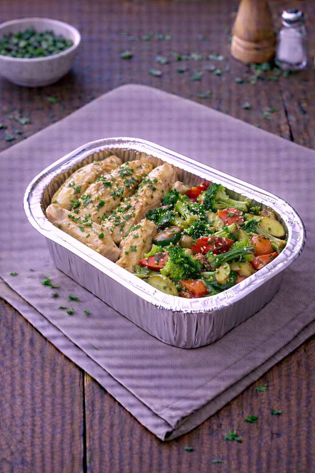 Aiguillettes de poulet, poêlée de légumes et graines de sésame. Vendues à la part.