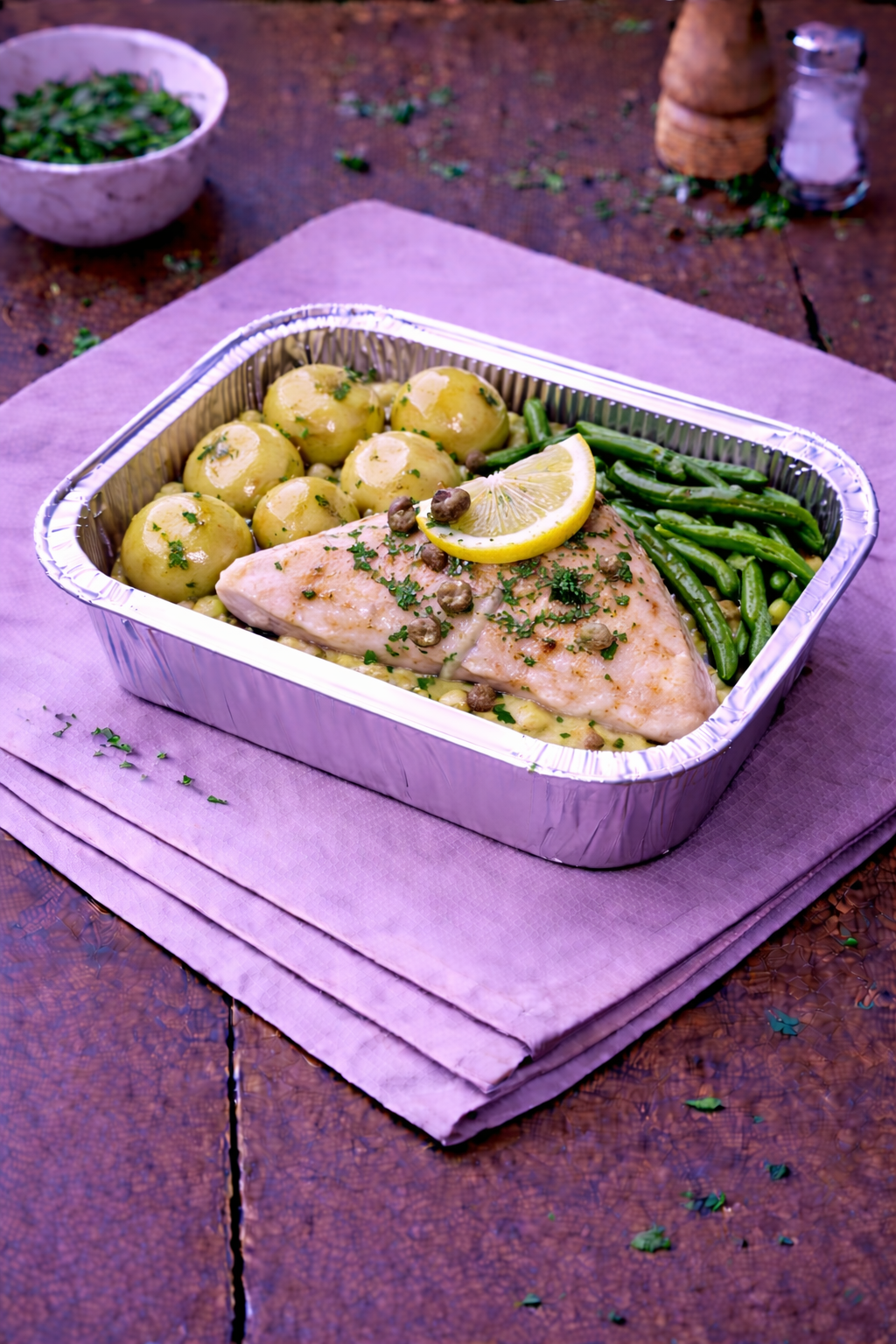 Aile de raie sauce aux câpres, pommes de terre vapeur et haricots verts. Vendue à la part.