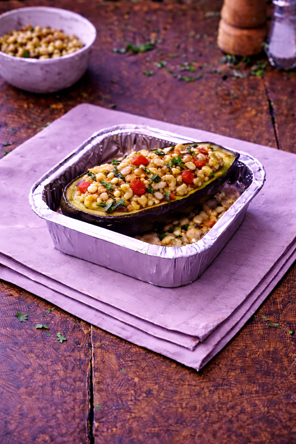 Aubergines farcies au riz safrané et pignons de pin torréfiés. Vendues à la part.