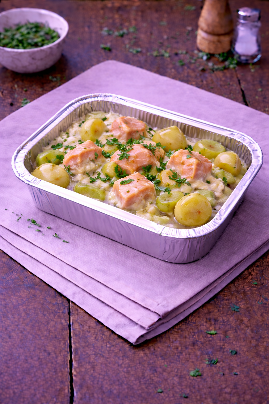 Blanquette de saumon, poireaux et pommes de terre. Vendue à la part.