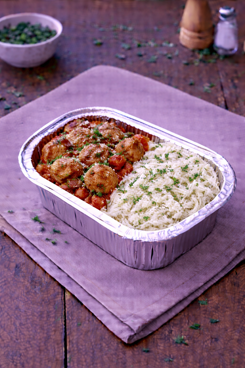 Boulettes de poulet à l’italienne et riz basmati. Vendues à la part.