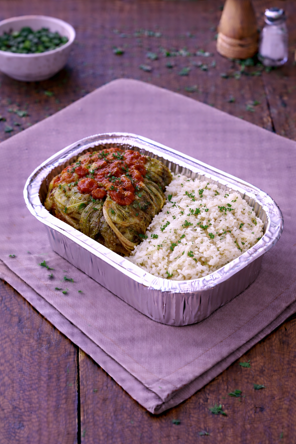 Chou farci accompagné de riz basmati. Vendu à la part.