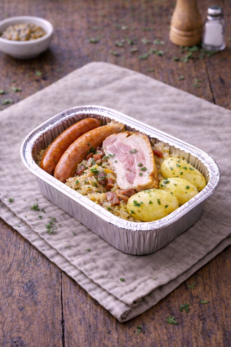 Choucroute alsacienne généreuse cuisinée maison. Vendue à la part.