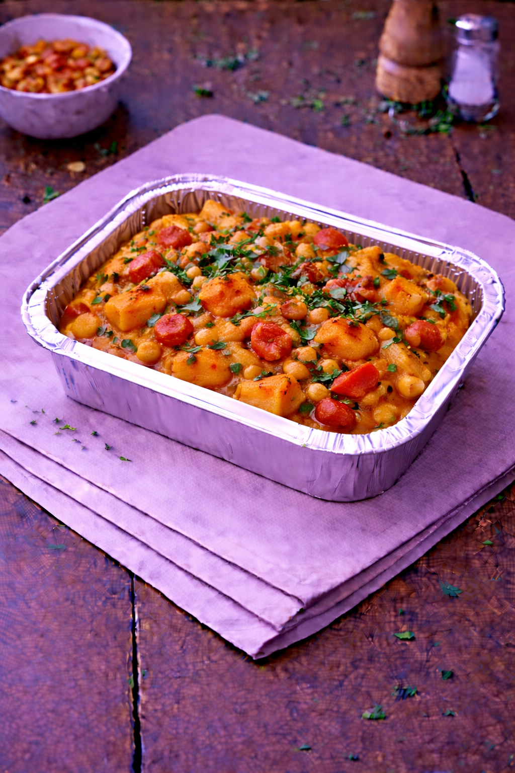 Curry de patate douce, pois chiches et poivrons mijotés. Vendu à la part.