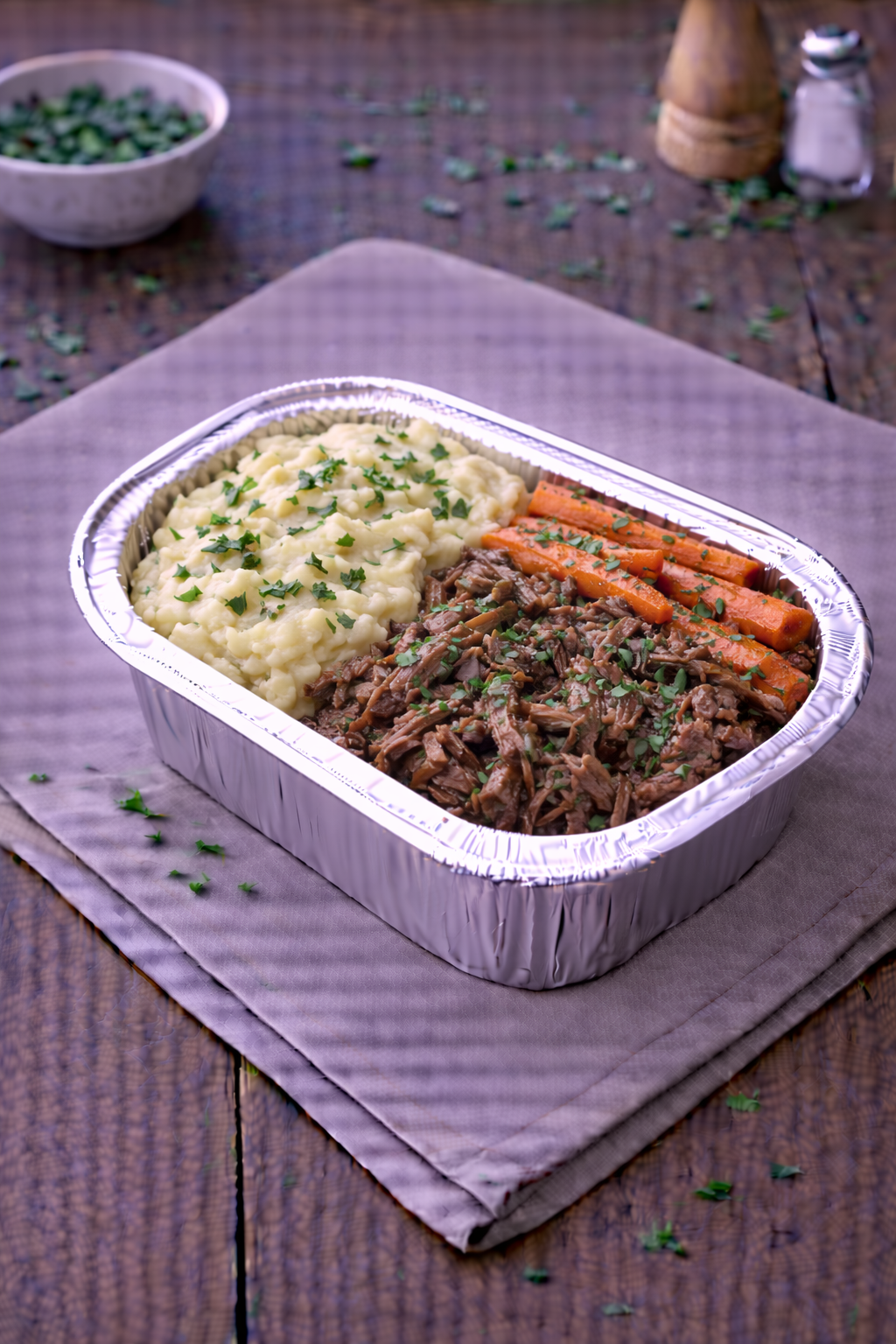 Effiloché de bœuf confit, écrasé de pommes de terre et carottes rôties. Vendu à la part.