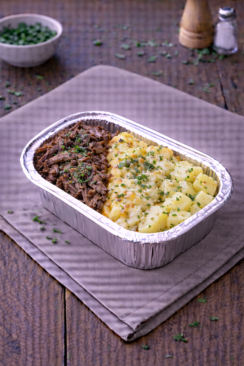 Effiloché d’épaule d’agneau confite et gratin de chou-fleur, pommes de terre vapeur. Vendu à la part.