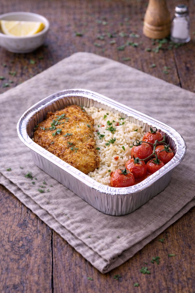 Escalope de veau à la milanaise, riz pilaf et tomates cocktail rôties. Vendue à la part.