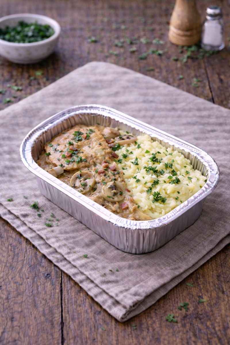 Escalope de veau à la normande et purée de pommes de terre persillée. Vendue à la part.