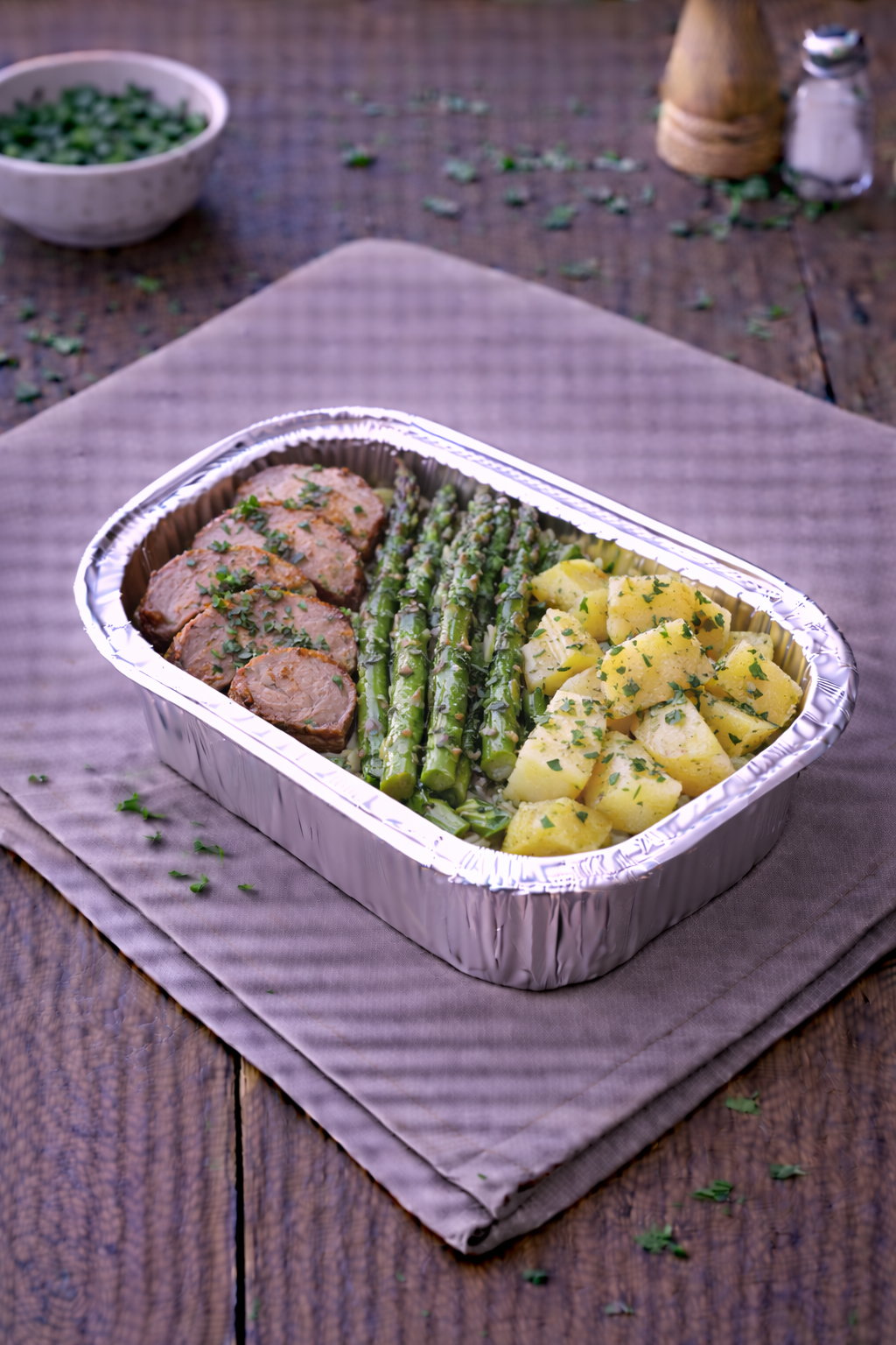 Filet de porc grillé, asperges vertes aux herbes et pommes de terre sautées. Vendu à la part.