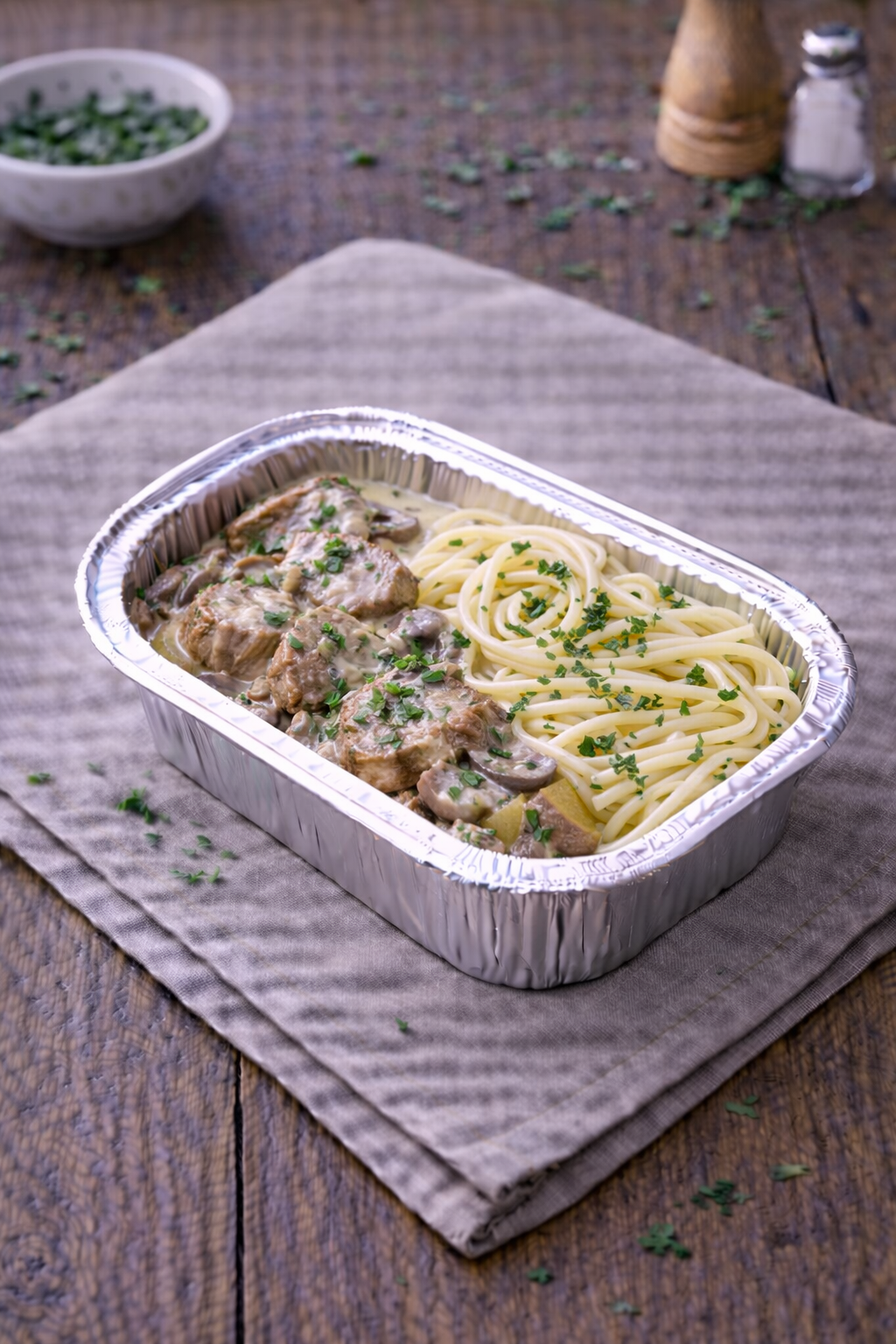 Filet mignon de porc au Boursin, champignons et spaghetti. Vendu à la part.