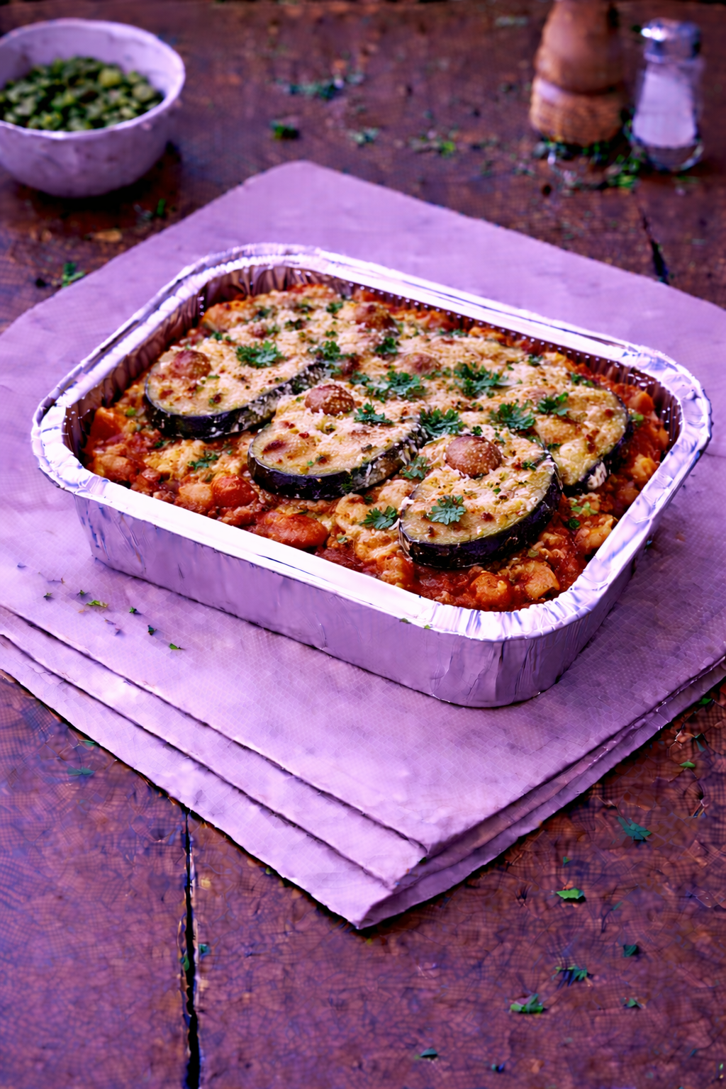 Gratin d’aubergines à la parmesane cuisiné maison. Vendu à la part.