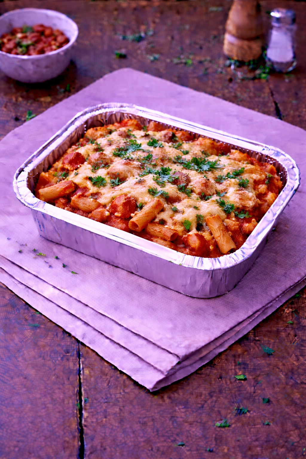 Gratin de Pennes à la sauce tomate maison et mozzarella. Vendu à la part.