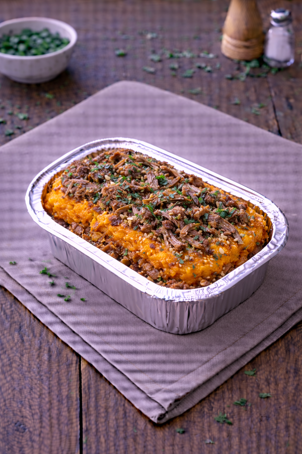 Hachis parmentier au canard confit et patate douce. Vendu à la part.