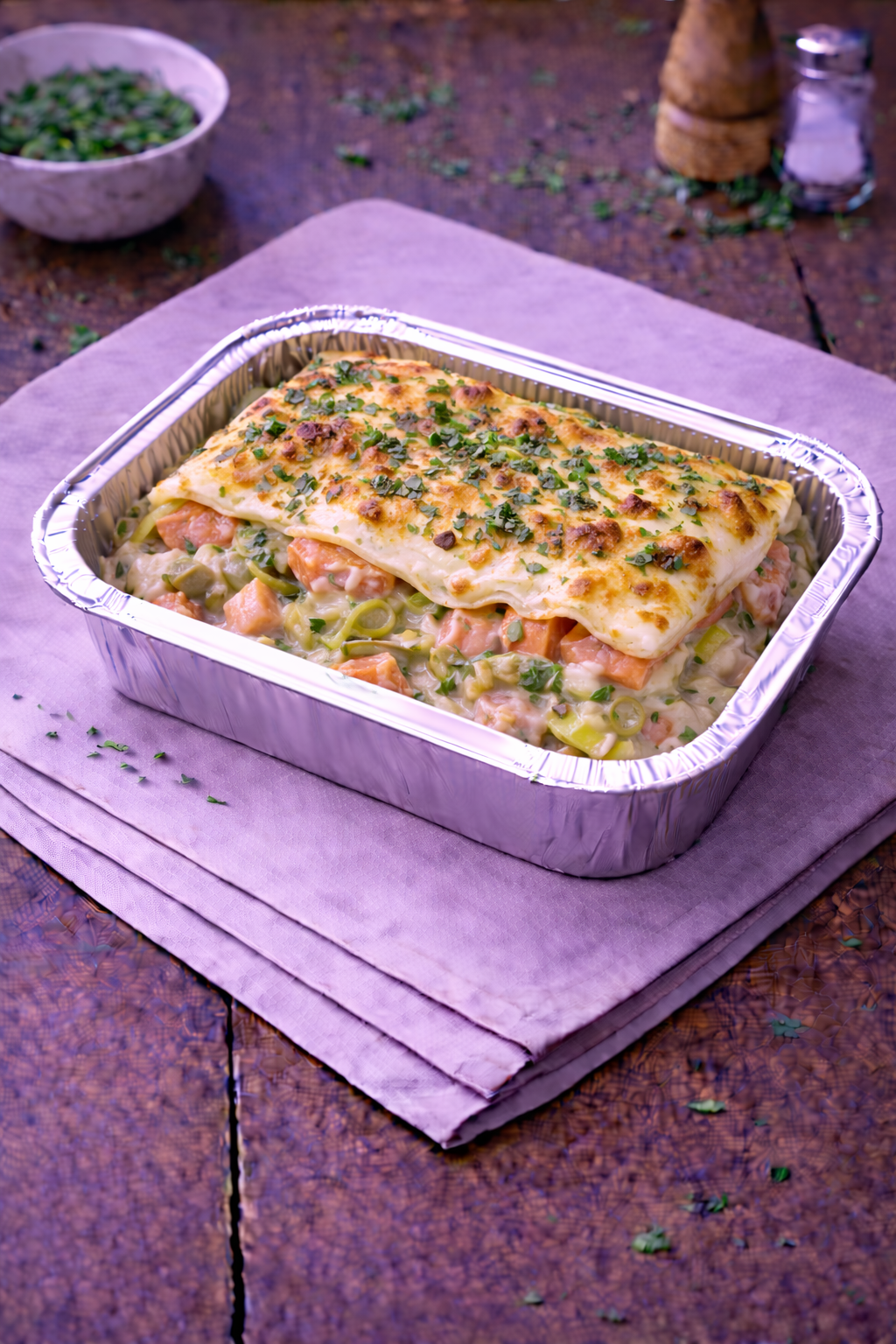 Lasagnes maison aux deux saumons et fondue de poireaux. Vendues à la part.
