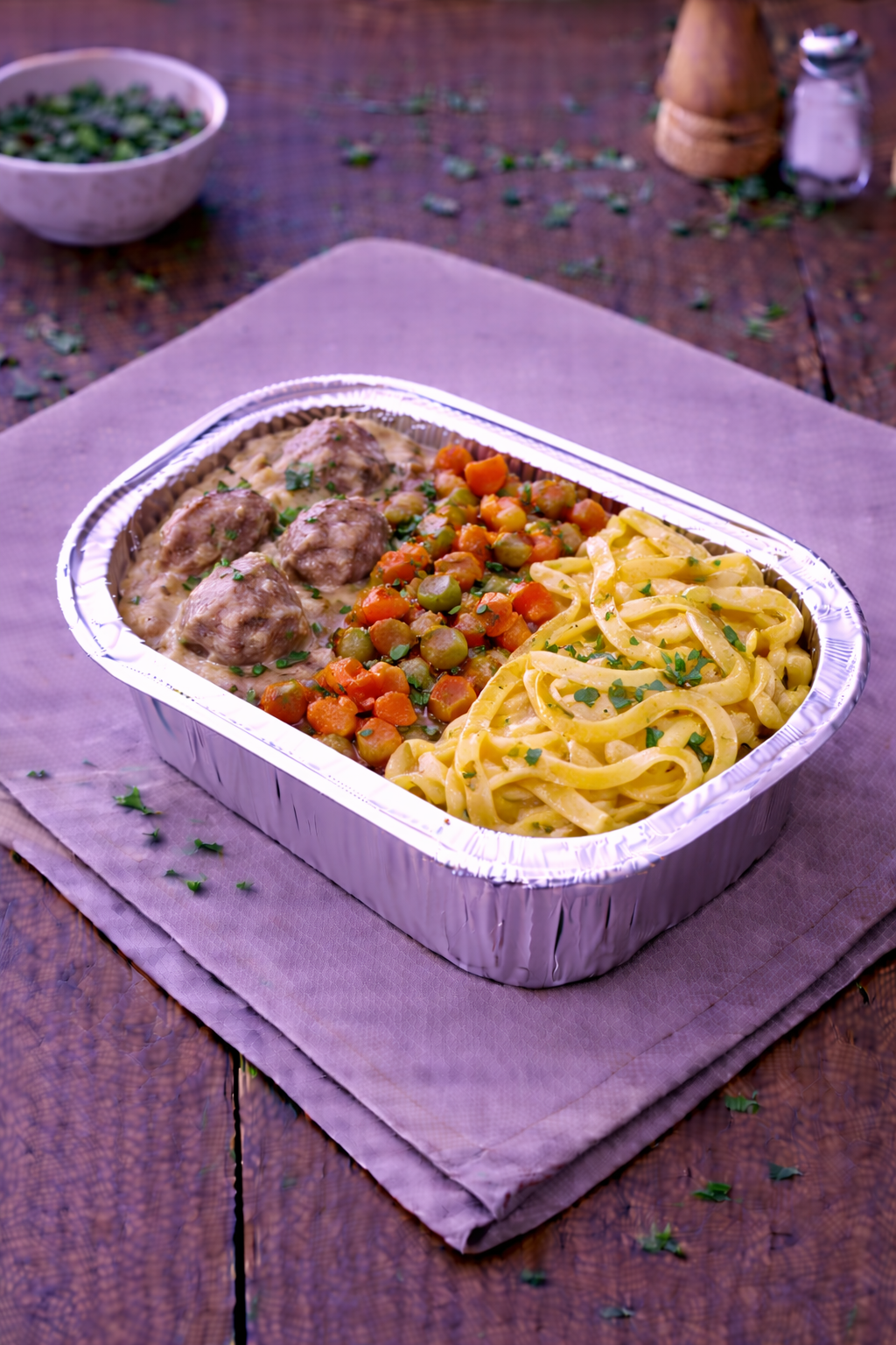 Noix de joue de porc crémé, brunoise de légumes et tagliatelles. Vendue à la part.