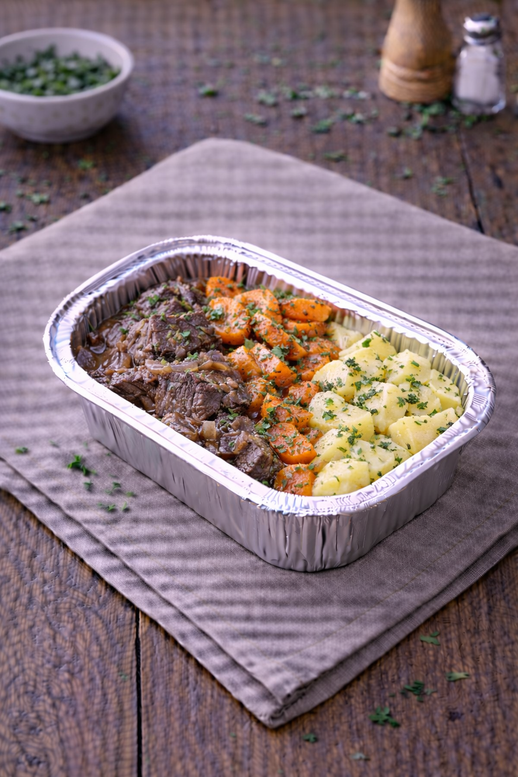 Paleron de bœuf confit aux échalotes, carottes aux herbes et pommes de terre. Vendu à la part.