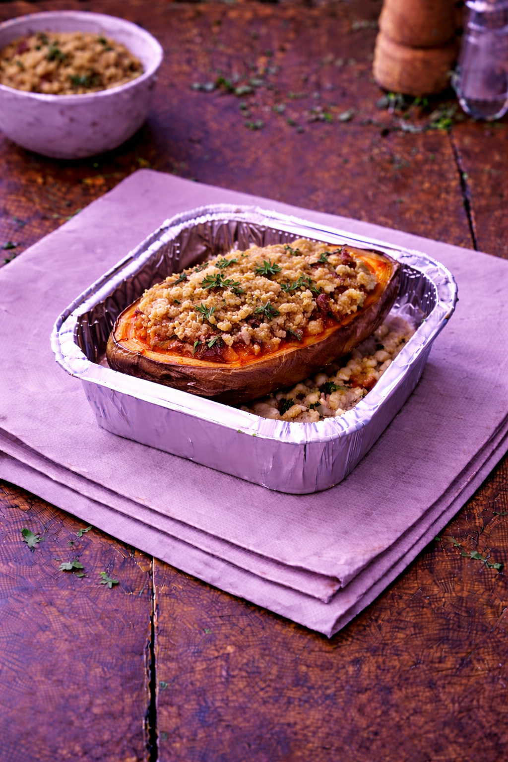 Patate douce farcie à l’oignon confit, chapelure au thym. Vendue à la part.