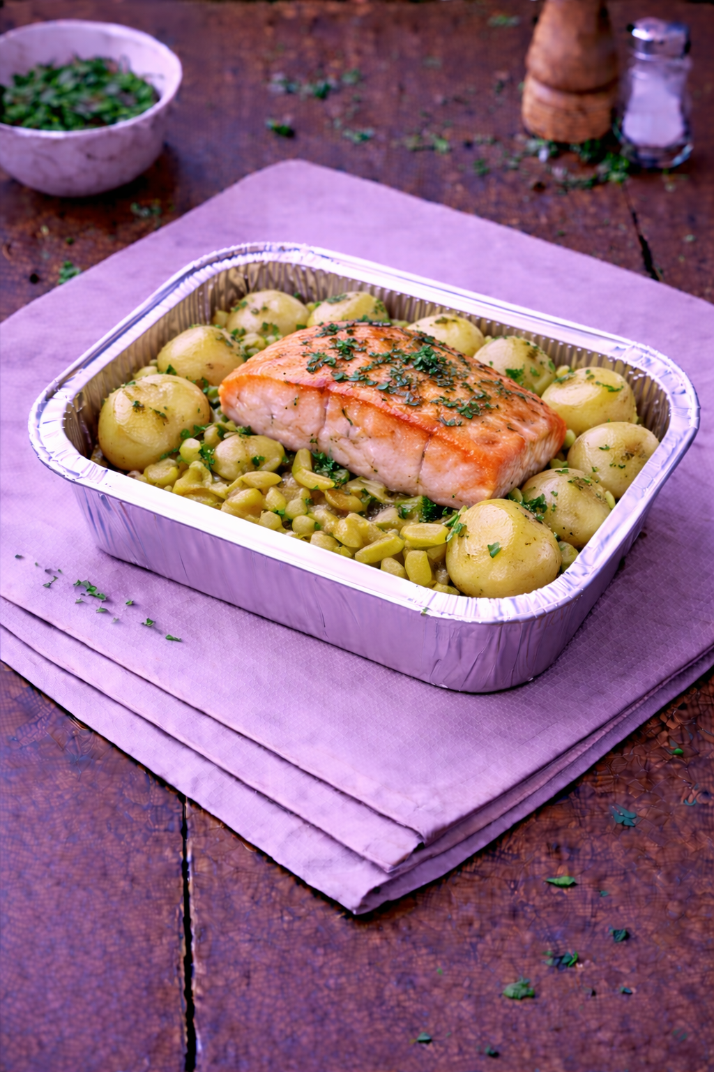 Pavé de saumon sur lit de poireaux et pommes de terre vapeur. Vendu à la part.