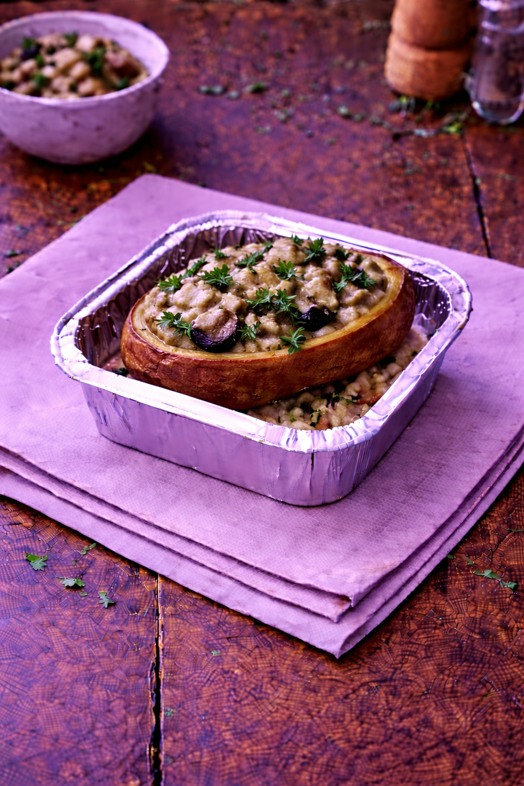 Pommes de terre farcies aux champignons et épinards. Vendues à la part.