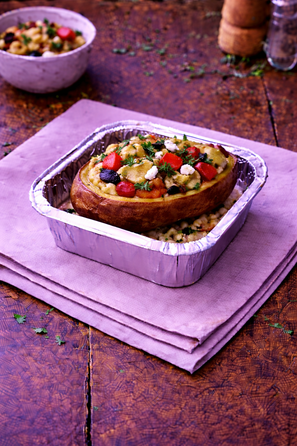 Pommes de terre farcies aux légumes grillés. Vendues à la part.