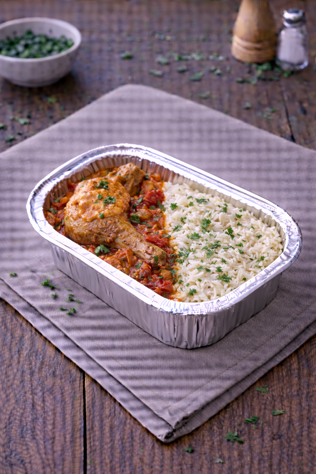 Poulet basquaise, crème de chorizo et riz basmati. Vendu à la part.