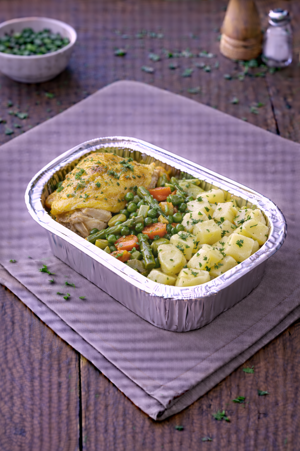 Poulet jaune des Landes aux légumes printaniers, pommes de terre vapeur. Vendu à la part.