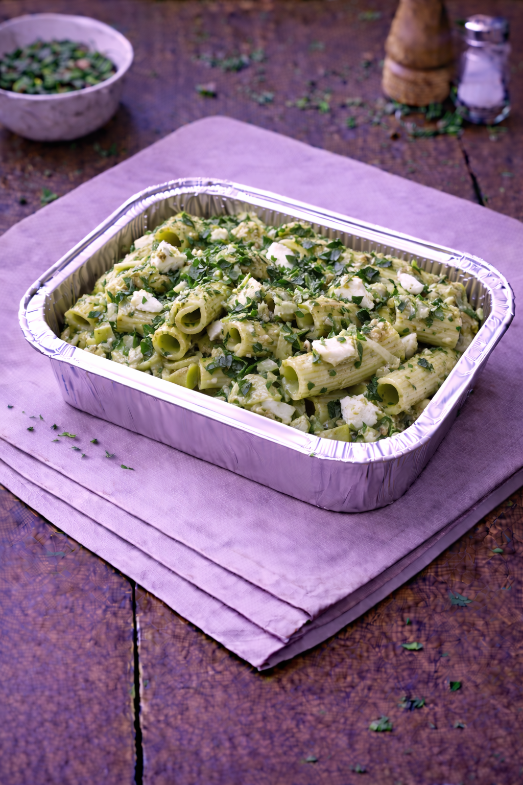 Rigatoni au chèvre, poireaux et pesto vert. Vendu à la part.