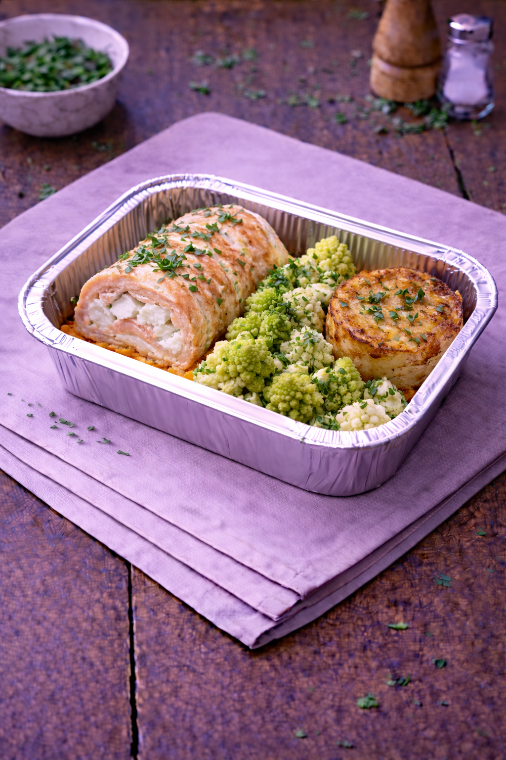 Rôti de saumon au chèvre, chou romanesco et galette de pommes de terre. Vendu à la part.