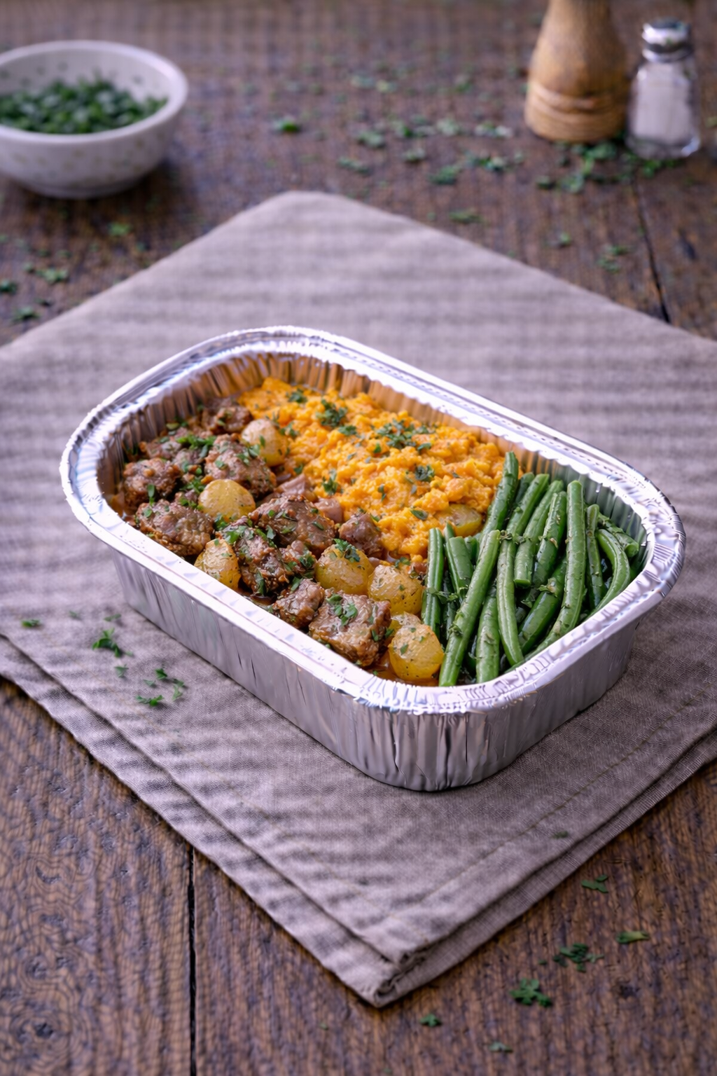 Sauté de canard aux navets confits, purée de patate douce et haricots verts. Vendu à la part.