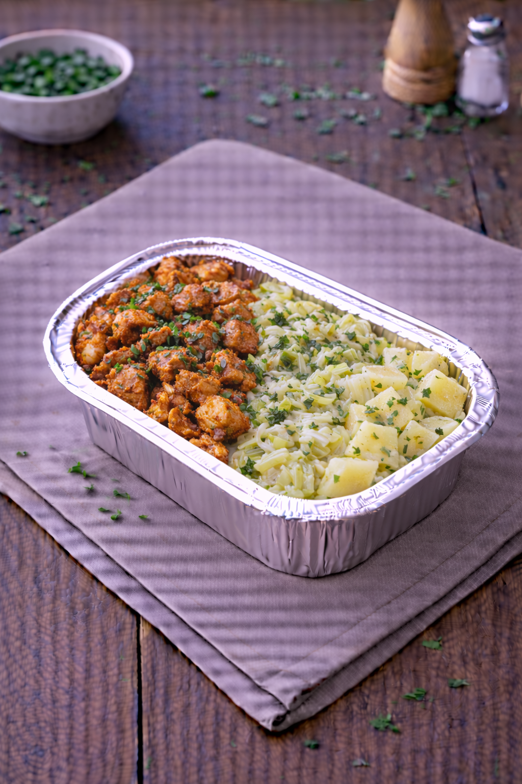 Sauté de dinde épicée sur fondue de poireaux, pommes de terre vapeur. Vendu à la part.