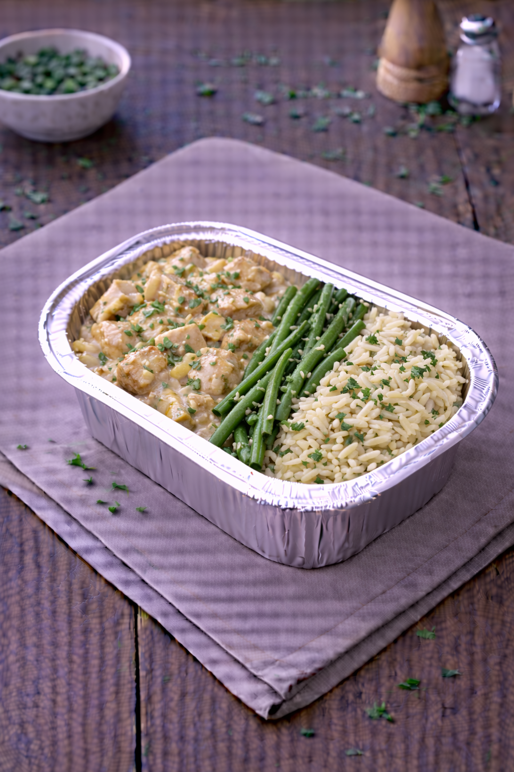 Sauté de poulet crémeux au gouda vieux, haricots verts et orzo. Vendu à la part.