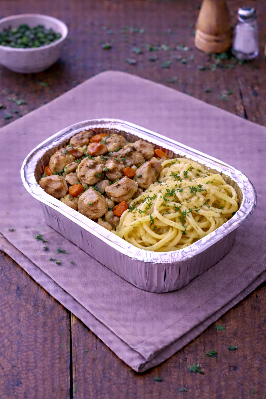 Sauté de poulet façon grand-mère, champignons et tagliatelles fraîches. Vendu à la part.
